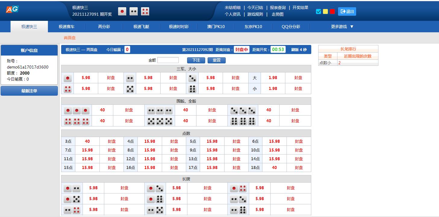 前后端分离、采集器也是分离的、搭建得费不少工费!看起没任何毛病,就是官方c的api是需要特制的,需要可以找群主哈、程序速度比迪士尼好太多。后台系统c的控制绝对是包杀的!杀大赔小,手机端可却换两套UI、前端都带独立代理系统、开户、报表、等等。话不多说了,上图。vue运行的速度以及开奖的速度简直太丝滑!