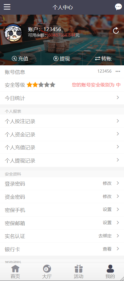 图片上面有PC蛋蛋和NG真人娱乐城,实际上是没有接数据的,下一步计划加上28玩法和娱乐城真人接口,有时间的话二开一个多语言,当然,下一个版本了