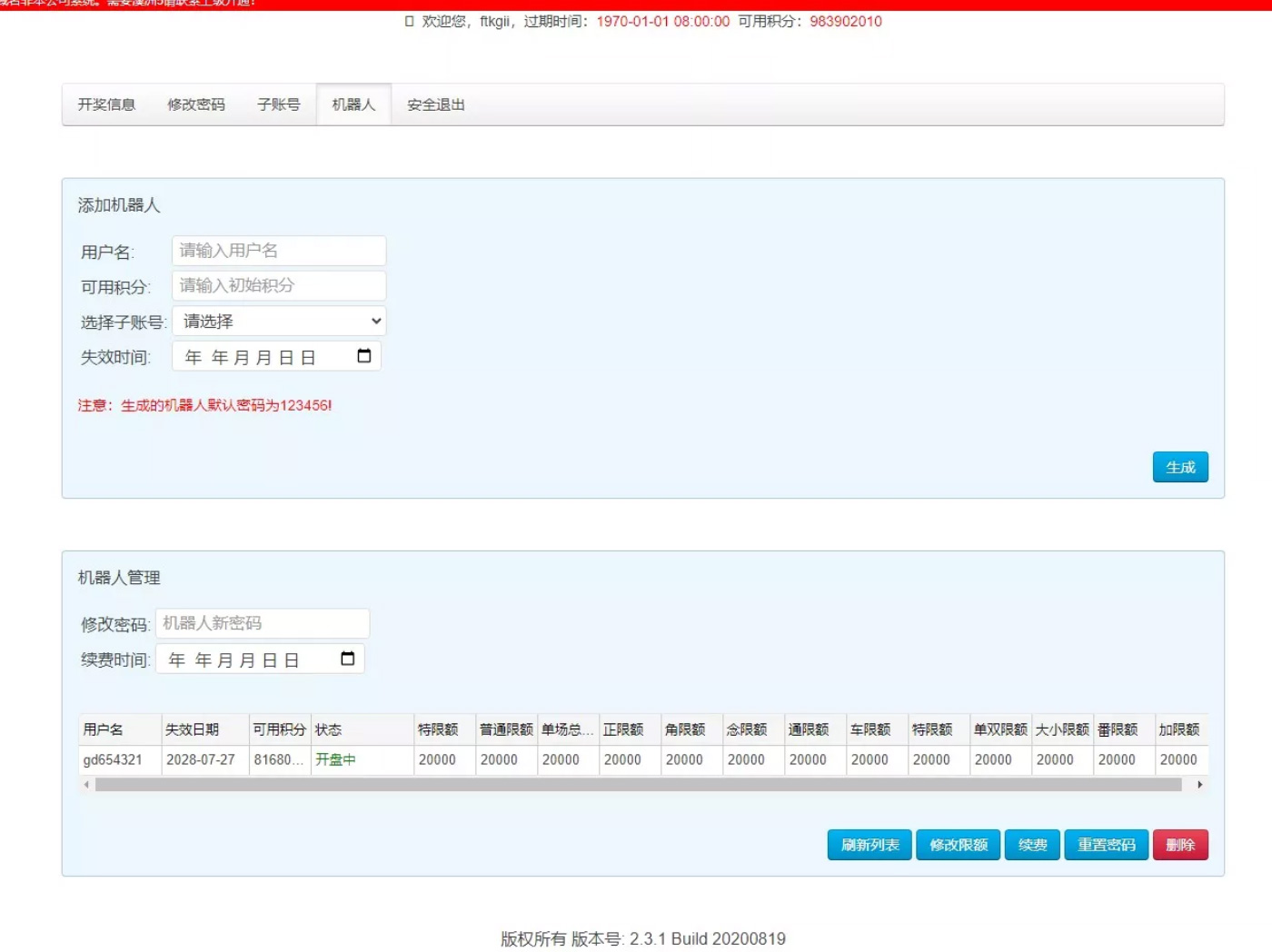 机器人后台 一键生成会员及托账号,两类账号均可设置自动或手动下注,