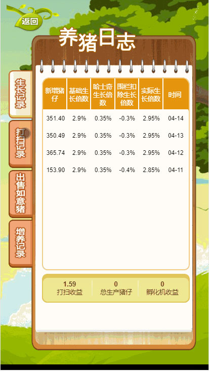 如意猪复利游戏模拟牧场游戏,新玩家投入330元在市场购买300只仔,用300只仔“开垦”一块养猪场绿地,兔场每天生产猪仔,每天收获的猪仔可以卖给其他玩家,也可以增养到养猪场里孵化喂养成如意猪,如意猪的数量越多生产的猪仔越多。玩家除小白兔生产猪仔收益外,还可以通过给推荐好友打扫养猪场来增加自己猪仔的数量(直推好友越多,打扫次数越多,打扫会得到好友一次产猪仔量10%的奖励)从而达到猪仔数量的积累。
