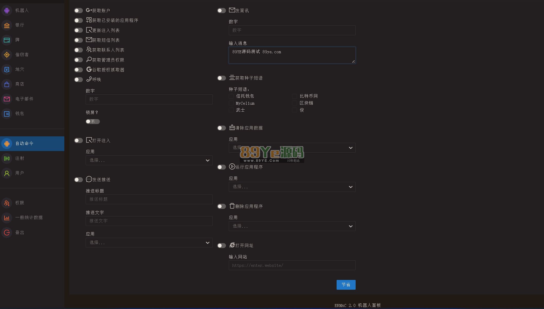 架设不难,docker完成。有详细的架设视频,和打包视频!APK只有984KB,我们架设测试了下,功能确实强大!什么通讯录短信获取都是小儿科了,可以推送短信,还有通知,可以模拟电话,转接呼叫,可以注入,获取应用信息,运行指定应用,还能远程打开网址,获取google authenticator 身份验证抓取,gmail邮件获取。还有别的功能,主要是对这个没性趣,就没在研究了。只是挺好玩!测试的时候我们用夜神模拟器测的。